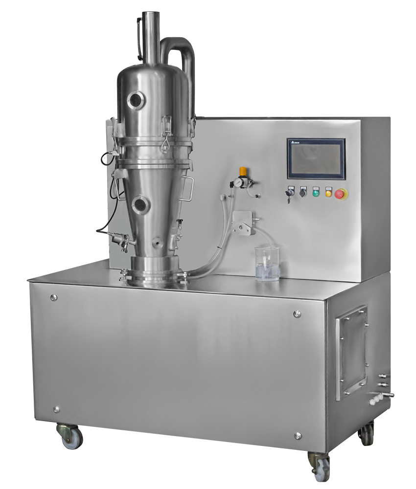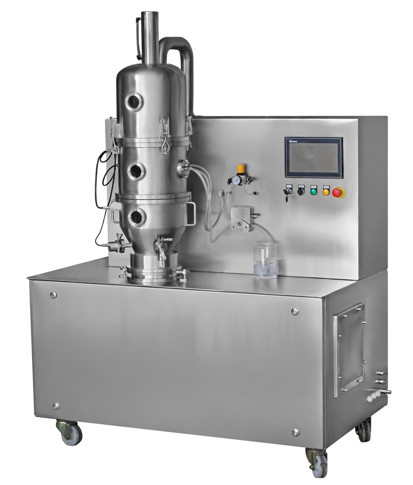 The fluidized bed process machine (FBP) - in a capacity of 5 liters - is one of the most important devices in the laboratory, with which you can perform three operations of drying, granulation and coating. Transfer the granules made in the high speed mixer (laboratory capacity) into the container and dry it from the FBD menu. Or granulate and dry the granules at the same time by the FBG section of the machine (without the need for a high speed mixer). You can also cover the pellet from the FBC part of the machine.